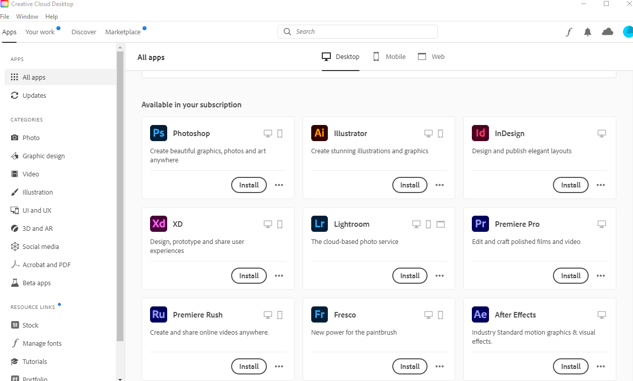 6. Once you have signed in, navigate to your desired Adobe application and press the "Install" button. Please allow some time as these applications are quite big. Once installed, you should see it in the "All Apps" menu on the left hand side.